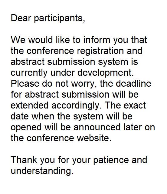 Сonference registration and abstract submission system is currently under development. The deadline for abstract submission will be extended accordingly. The system opening time will be announced later. |